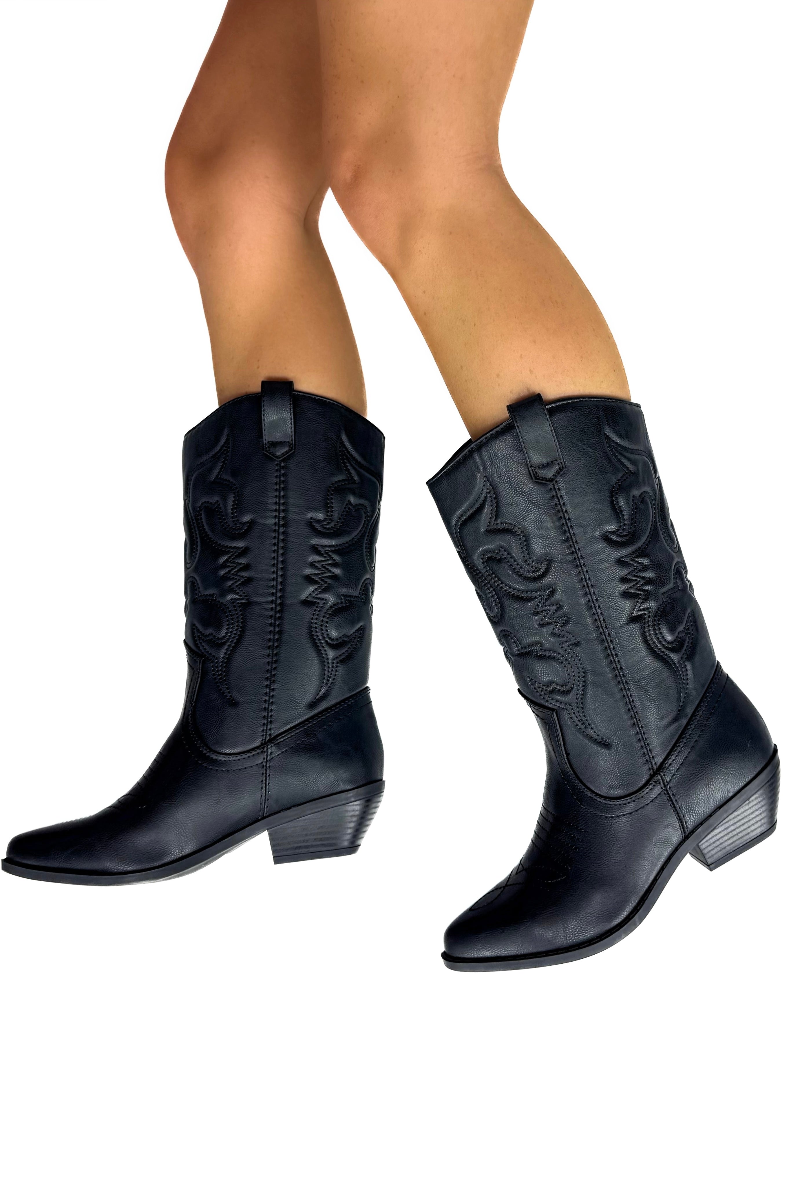 Our Yee-Haw Pleather Western Boots in Black are exactly what you need for almost any occasion! You can wear them to your gameday, concerts and so much more! The white color and stitch detailing make it easy to match with any outfit! They will become your new favorite go-to boot to pair with all your outfits all season! Every girl needs a pair of basic black boots to have in her closet!
