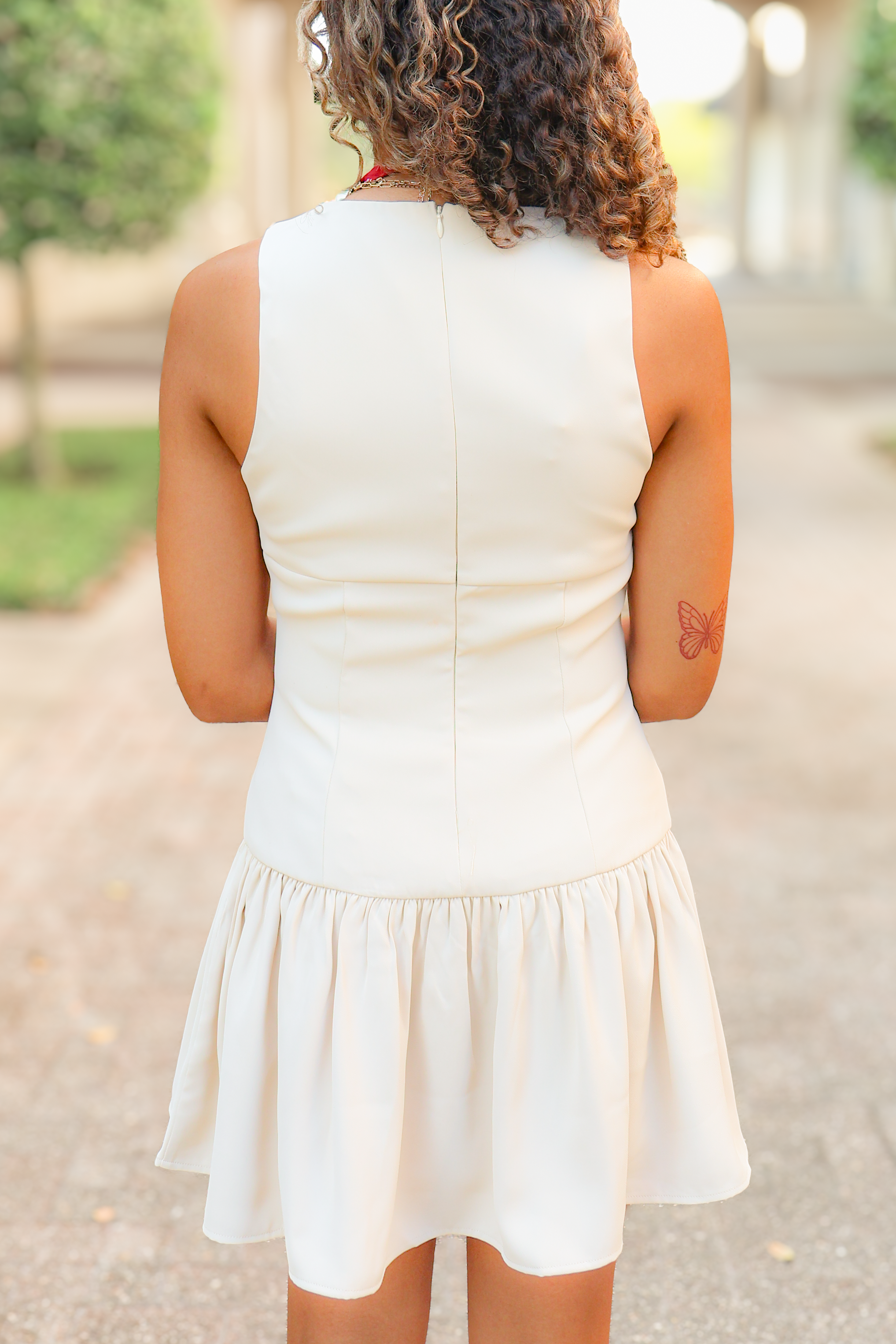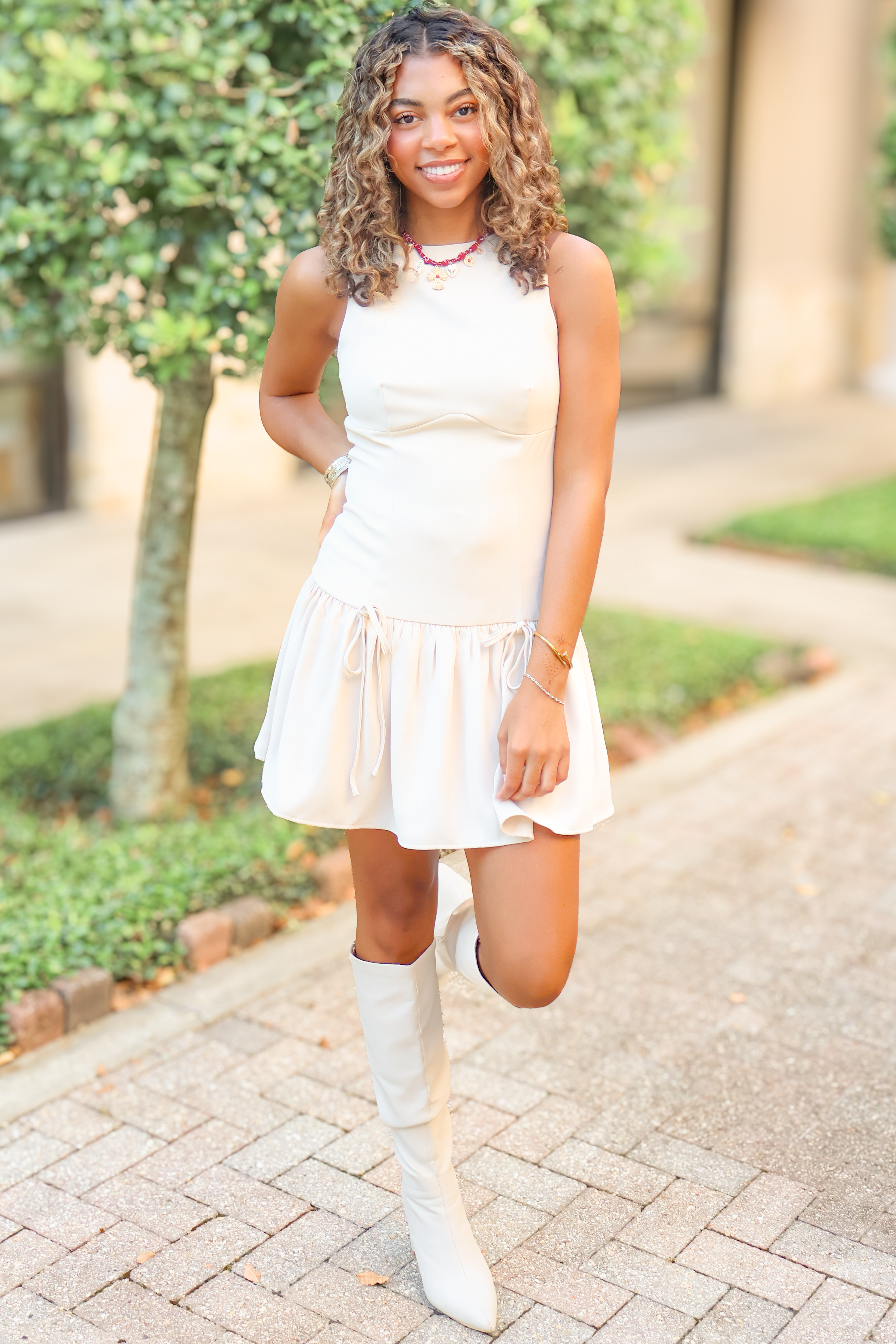 Wear our Just Wanna Have Fun Ribbon Details Mini Dress with pink heels and simple bag  to a wedding or other special event or style this sleeveless mini dress with knee boots and a bag for a dressy night out with friends! This mini dress is exactly what your summer wardrobe has been needing! You do not want to miss out on this gorgeous and comfortable mini dress!
