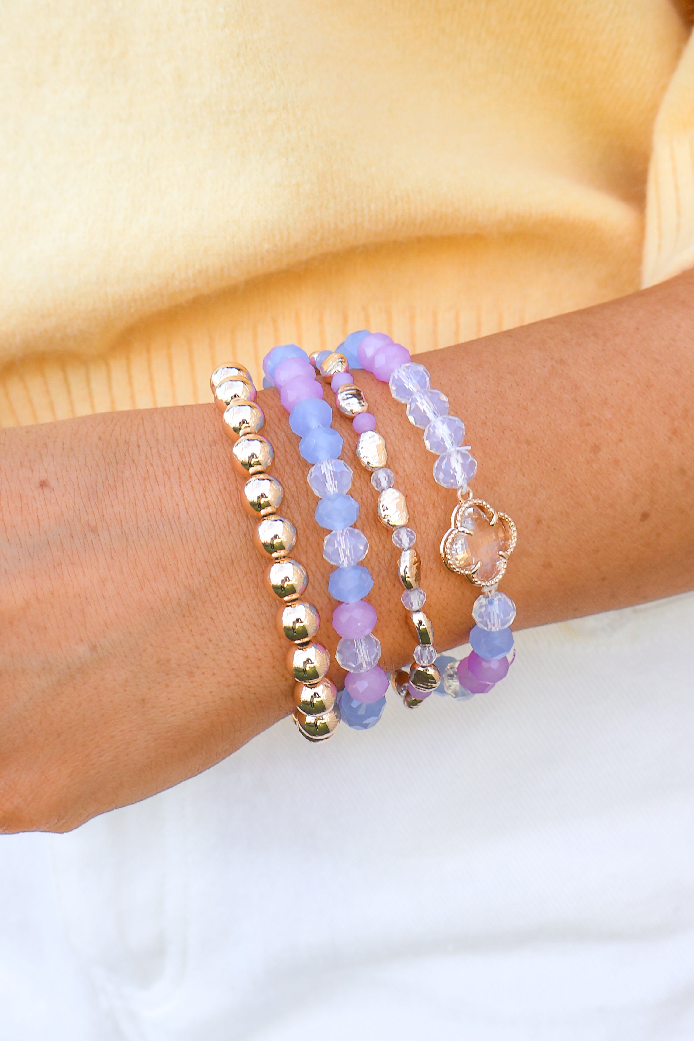 Pair our More Than Happy Clover Charm Bracelet Set in Periwinkle with a floral dress and heels for a day out or style this bracelet with a pair of jean shorts and a colorful spring top for a brunch date. You do not want to miss out on this stunning bracelet set!