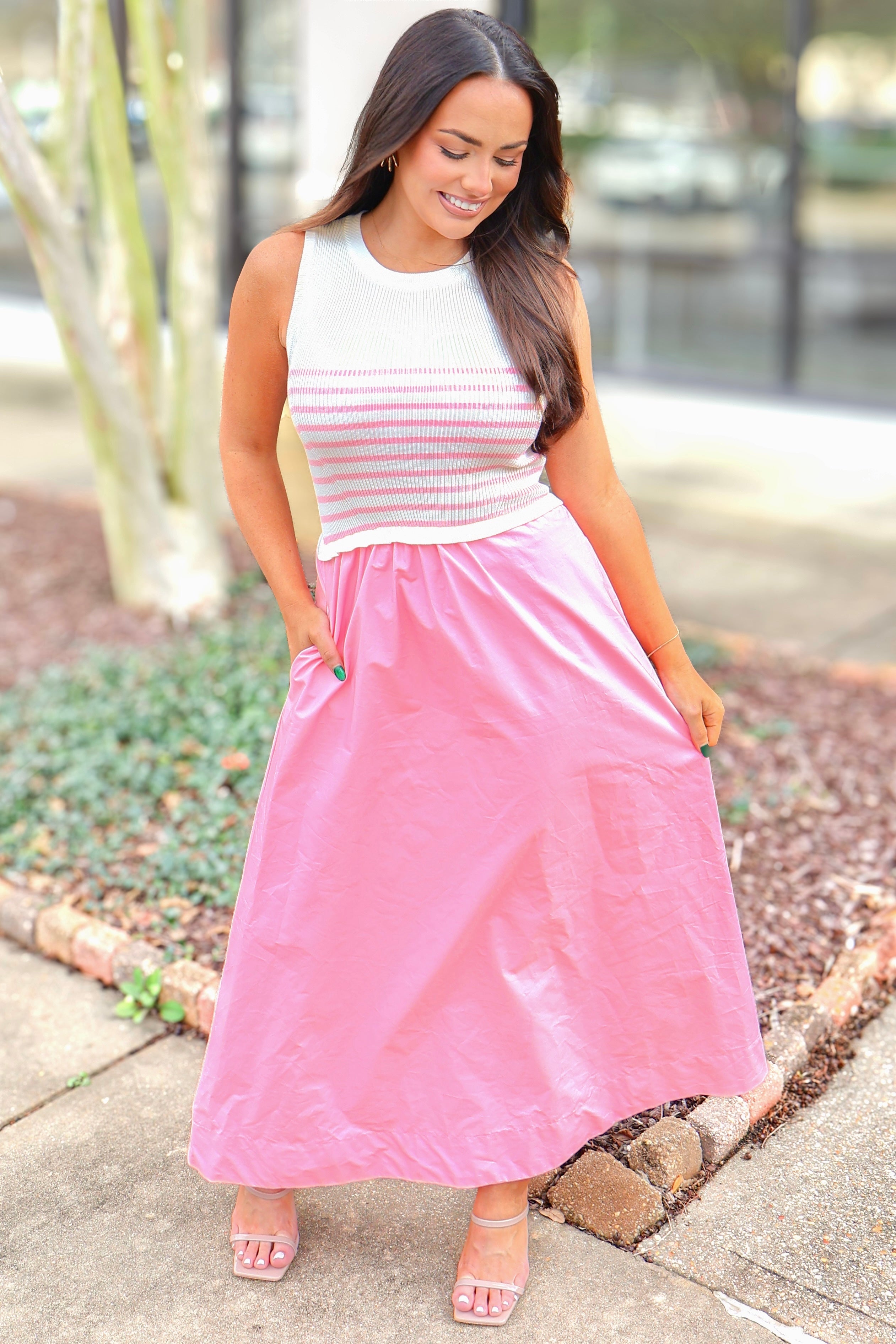 Pair our Spring Awakening Stripe Knit Top Maxi Dress with a fun pair of heels perfect a brunch outfit! Or dress this gorgeous maxi dress up with a platform heels and hoop earrings for a spring event! You need this dress all of your spring adventures! Do not miss out on this gorgeous maxi dress!
