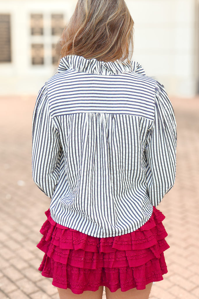 Our Back To Business Ruffle Detail Striped Blouse is the perfect new addition to your wardrobe! This fabulous top can be paired with practically any outfit or event! The long sleeve ruffle trim detail on the sleeves and striped print adds a girly flair to this top. Stay comfortable and cool during fall days or shopping days thanks to the soft, breathable material of this blouse. This is the perfect transitional piece for the upcoming season!