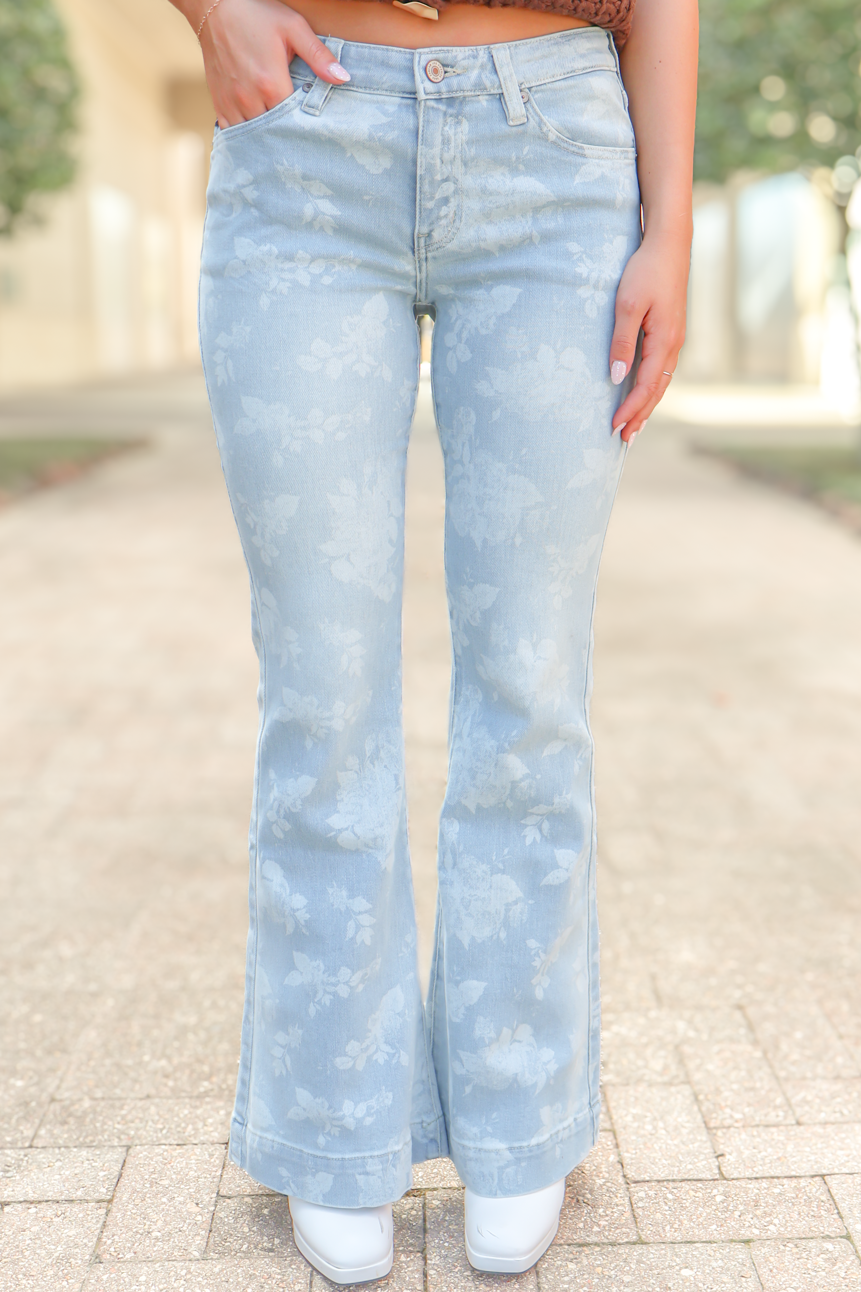 Wear our Better Than Her Floral Stencil Jeans with a bodysuit and low strappy heels and cute bag for a girls night out or pair with a cute top and sneakers for an adorable gameday look! Elevate your wardrobe by adding these stylish floral detail jeans to your cart now! You do not want to miss out on these adorable jeans!