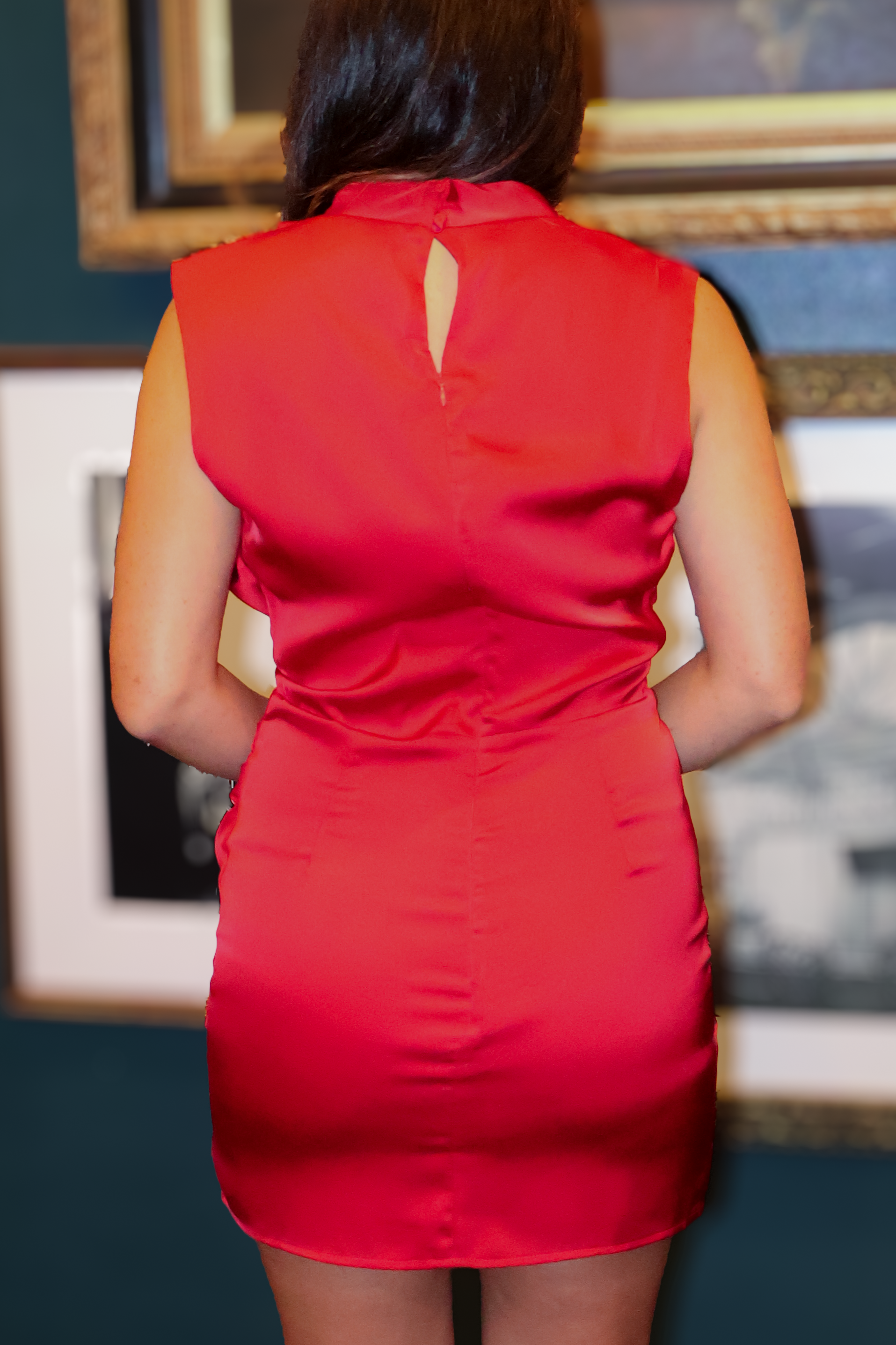 Wear our Elegant Essence Draped Satin Dress with pink heels and simple earrings to a wedding or other special event or style this studded bow dress with sandals and a headband for a dressy night out with friends! This draped satin dress is exactly what your wardrobe has been needing! You do not want to miss out on this gorgeous and comfortabledraped satin dress!