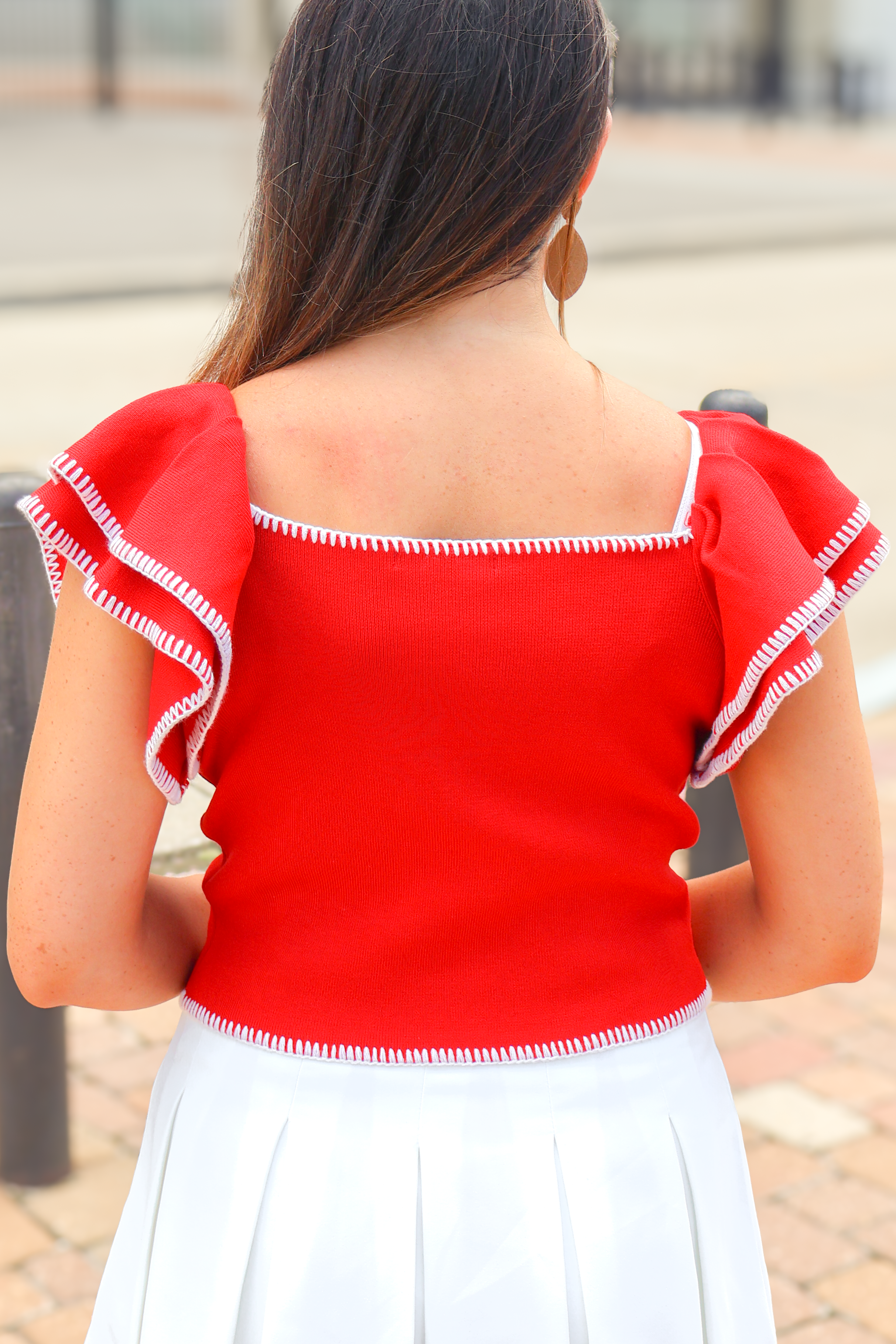 Our Glowing Girl Knit Tank in Red is the cutest new piece for the season! You will want to wear this gorgeous knit tank to every event you attend this summer! The stretchy, knit fabric and ruffle sleeves are so comfortable and flattering for every body type. The white stitching detail along all of the hems adds a flair to this piece!