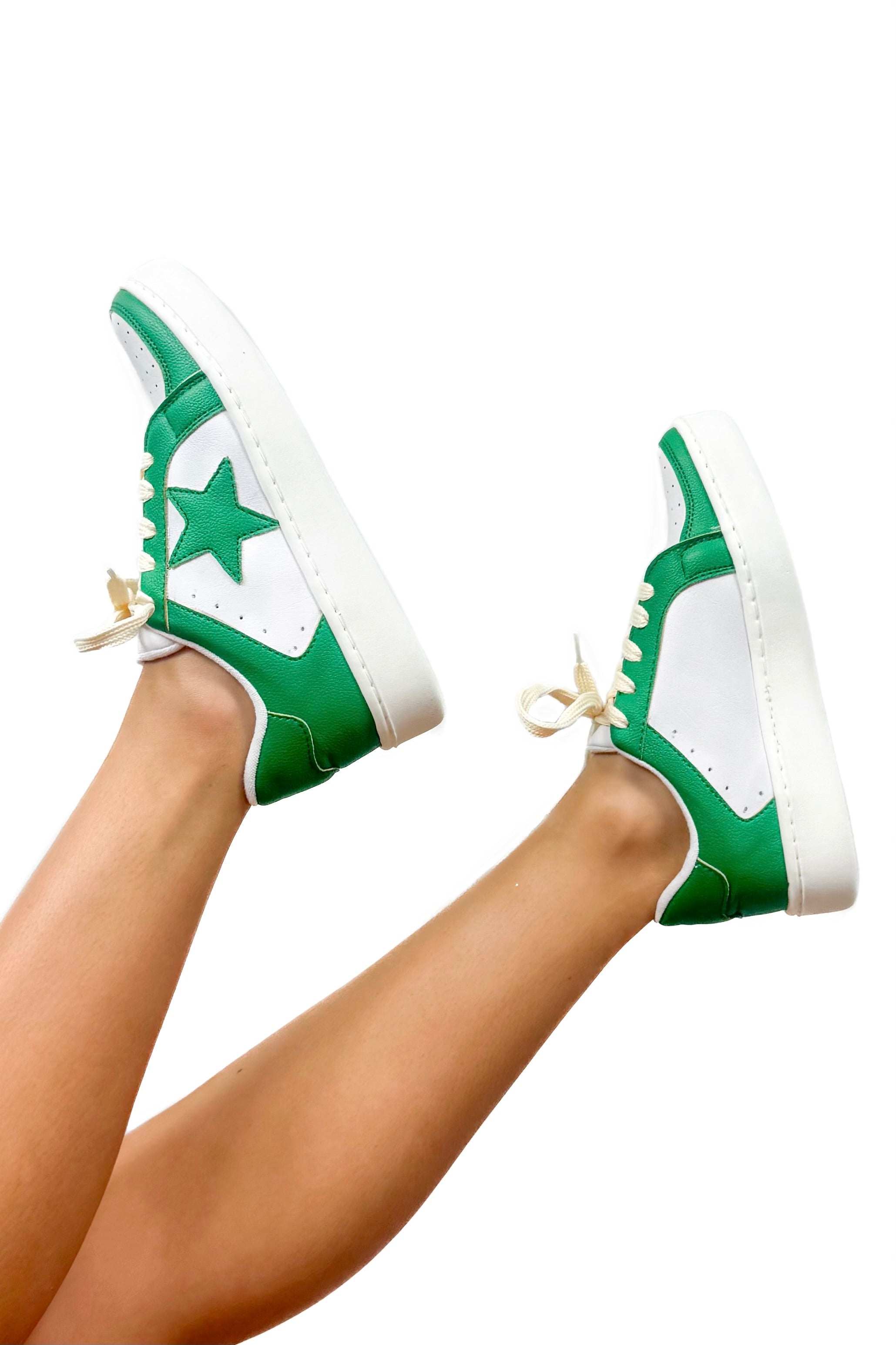 Pair with pleather pants and an oversized sweater for a cozy, yet stylish gameday look! Or pair with a graphic gameday tee and a skort for a casual look! Hurry you wont want to miss out on our Headed to the Stadium Two Tone Sneakers in Green!