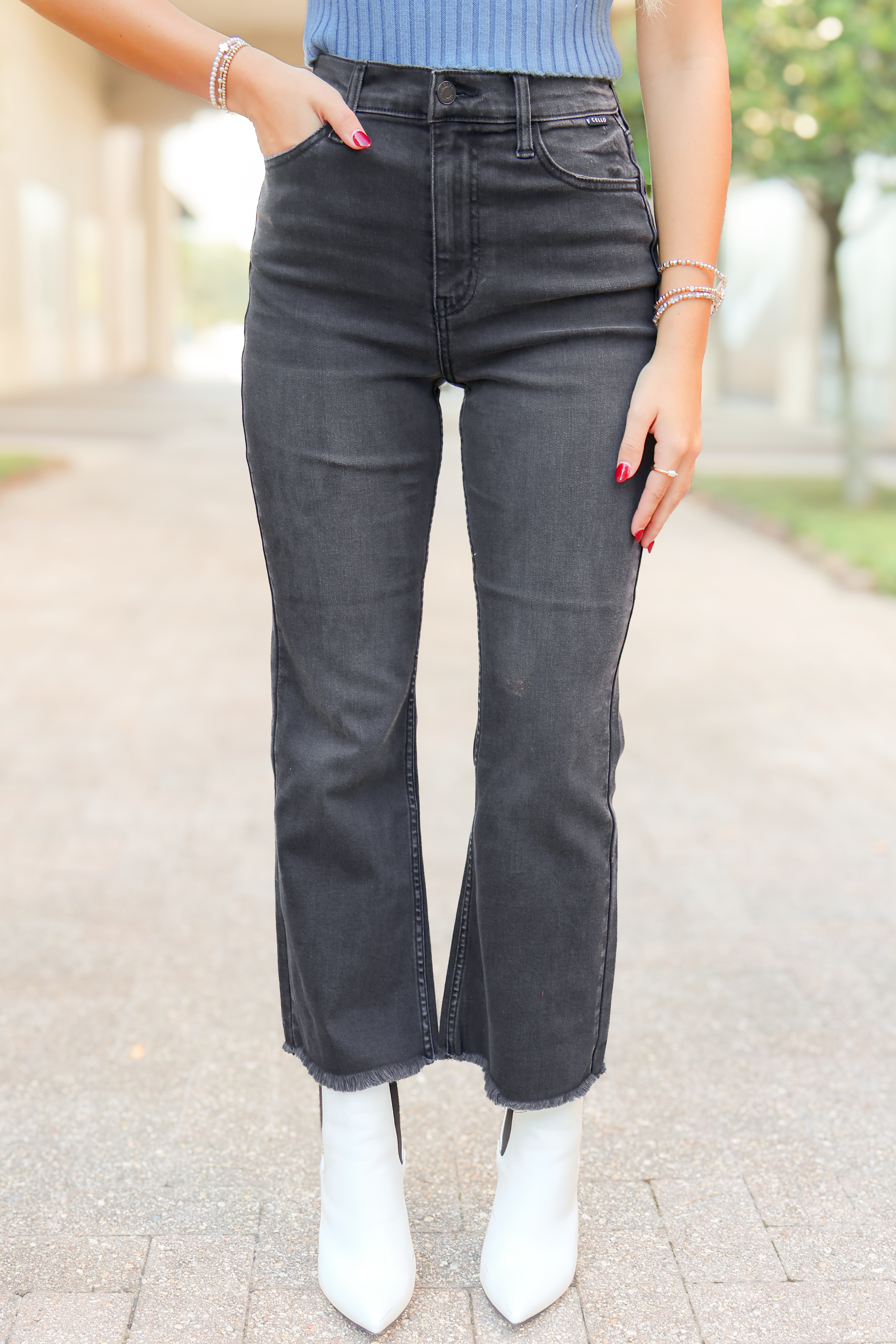Wear our How's It Going Cropped Flare Raw Hem Jeans with a tee and fashionable sneakers for a casual look or style these flare leg jeans with a colorful blouse and heels for a dressy outfit perfect for date night! Elevate your wardrobe by adding these stylish flare leg jeans to your cart now! You do not want to miss out on these flare leg jeans!