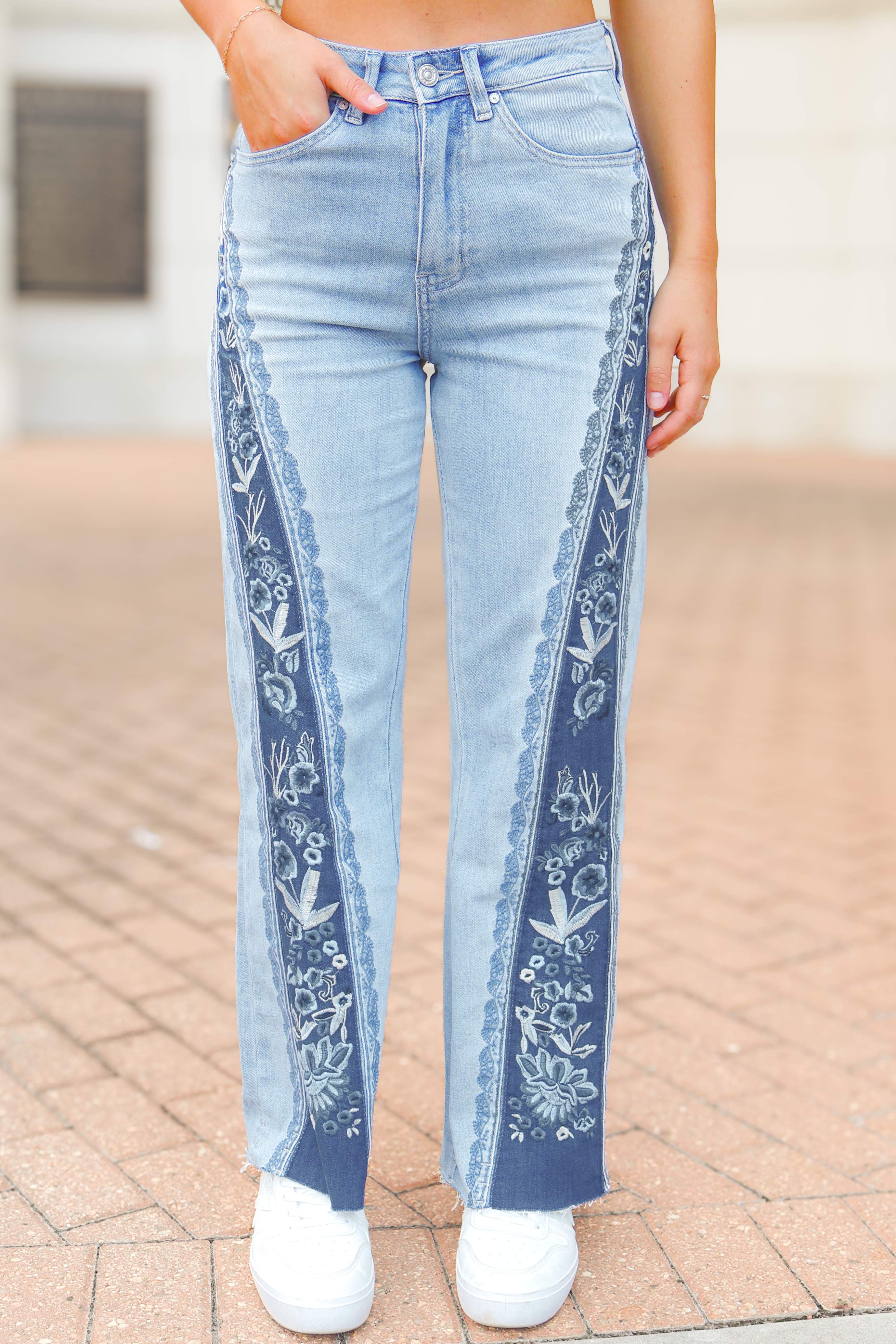 Our Let Them Talk Floral Detail Raw Hem Jeans are the perfect piece no matter the season! These raw hem jeans have the ideal straight fit style while still allowing them to be comfortable and not restricting. The medium denim color of these jeans and the floral details adds a unique and girly touch to these simple jeans. The high waist style of these raw hem jeans is so flattering for every body type.