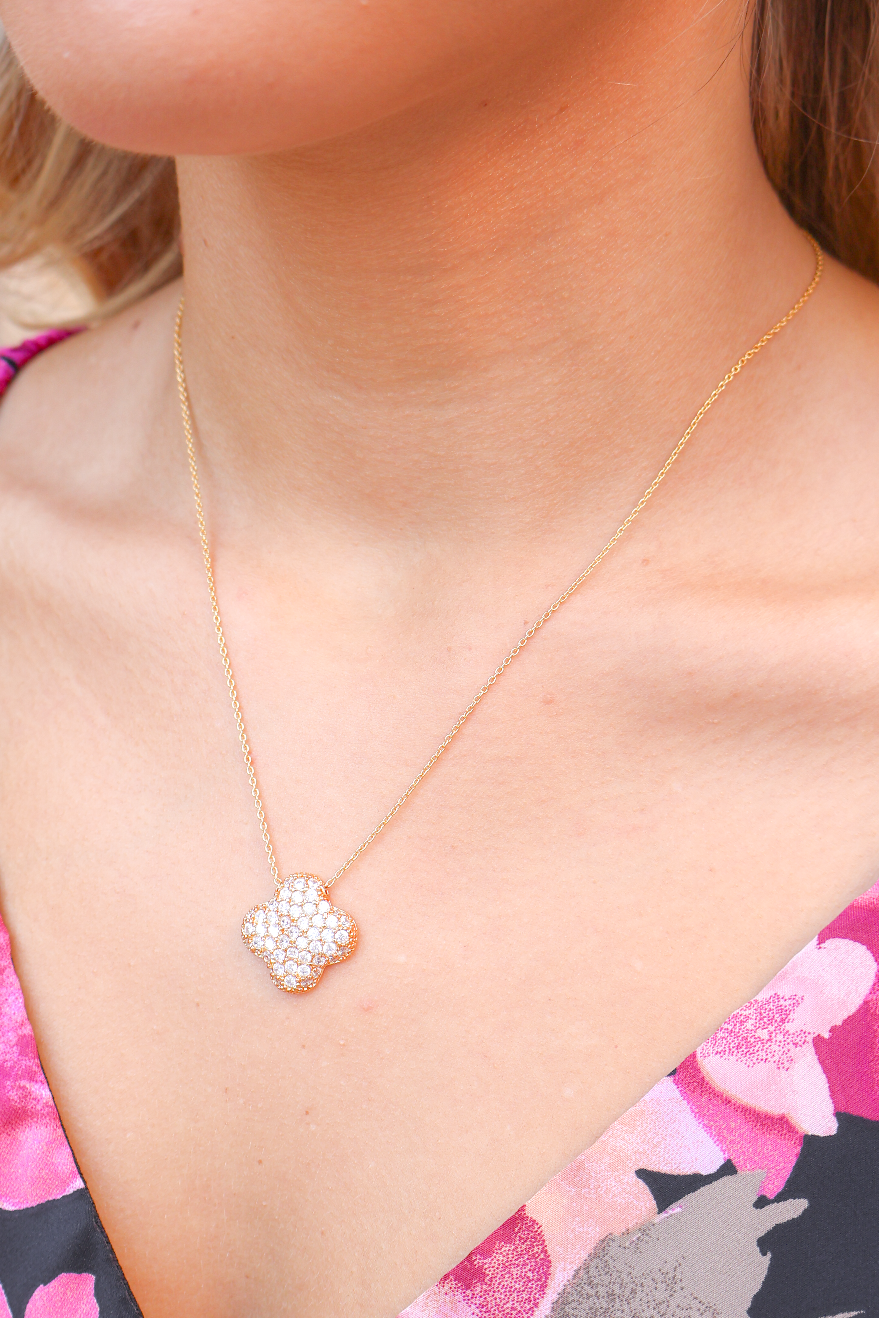 Wear our Living The Dream Rhinestone Clover Pendant Necklace with a cute sundress and wedges for a girly date night look or style with denim shorts and a tank for a more casual outfit! This clover pendant necklace will truly enhance any look it is paired with.
