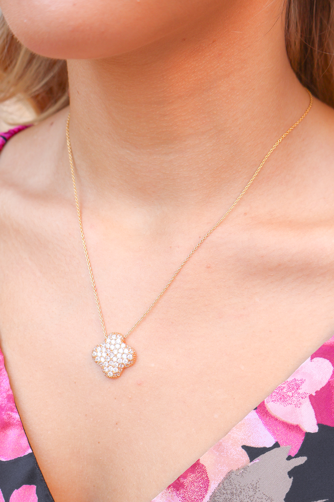 Our Living The Dream Rhinestone Clover Pendant Necklace is the perfect simple everyday accessory! This gorgeous rhinestone pendant necklace will elevate any outfit. The girly yet simple gold chain adds a chic vibe to the simple and elegant accessory. The rhinestone covered clover charm is sure to catch eyes and draw their attention to this gorgeous accessory. The adjustable chain allows you to decide how long you would like this necklace and also adds room in case you are wearing a high neck top.