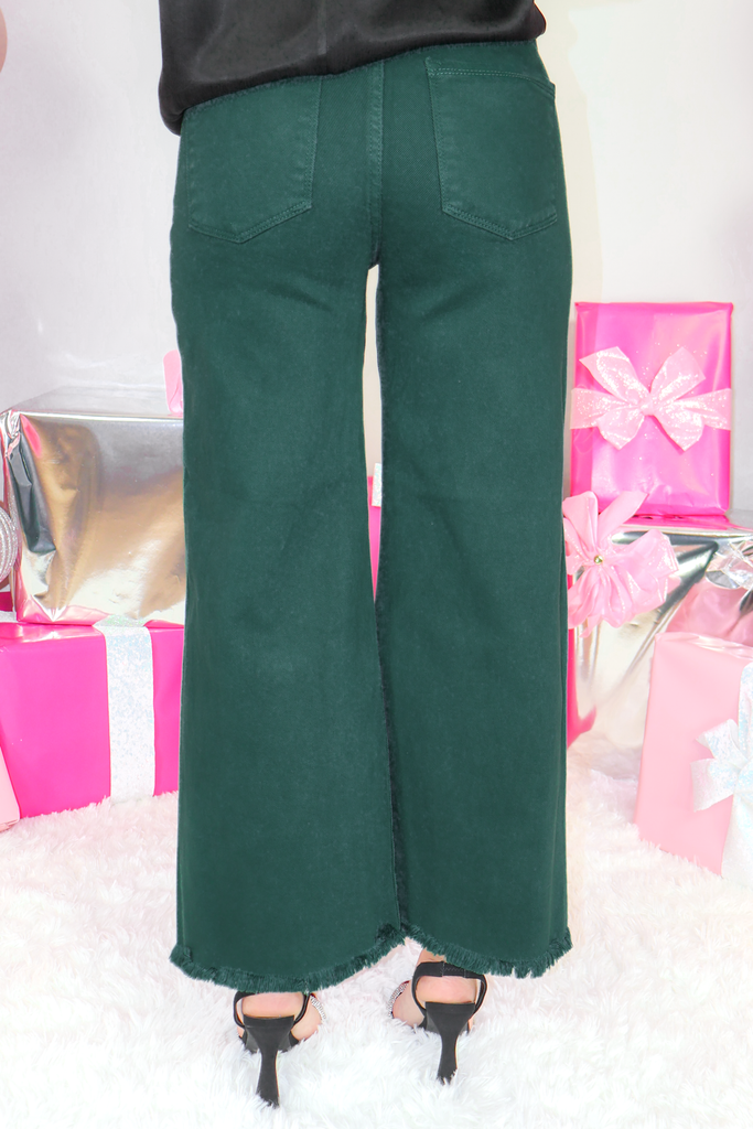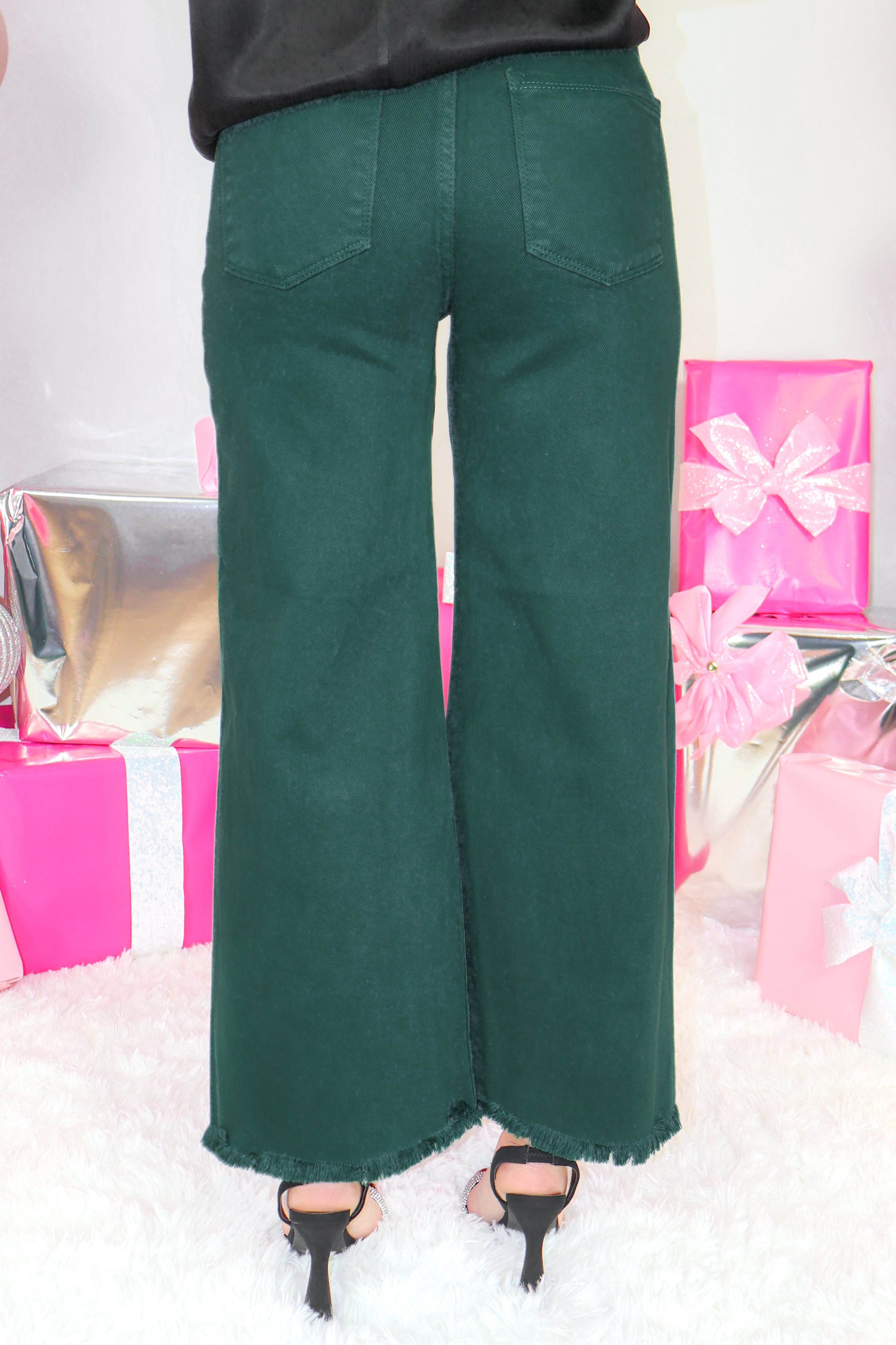 Our Never Phased Wide Leg Frayed Jeans are the perfect piece no matter the season! These wide leg frayed jeans have the ideal loose leg fit while still giving shape to the legs. The hunter green color of these jeans allow them to be worn for every day activities as well as for more festive occasions! The high waist style of these wide leg jeans is so flattering for every body type.