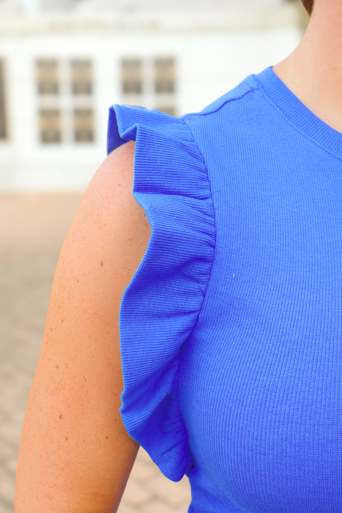 Wear our No Looking Back Ruffle Sleeve Top in Royal with light denim jeans and wedges for a cute dinner look, or style this tank top with one of our black skorts and an adorable pair of game day sneakers for a fun look perfect for cheering on your favorite team! You do not want to miss out on this gorgeous tank top! Allow this transitional top to take your wardrobe from summer to fall!