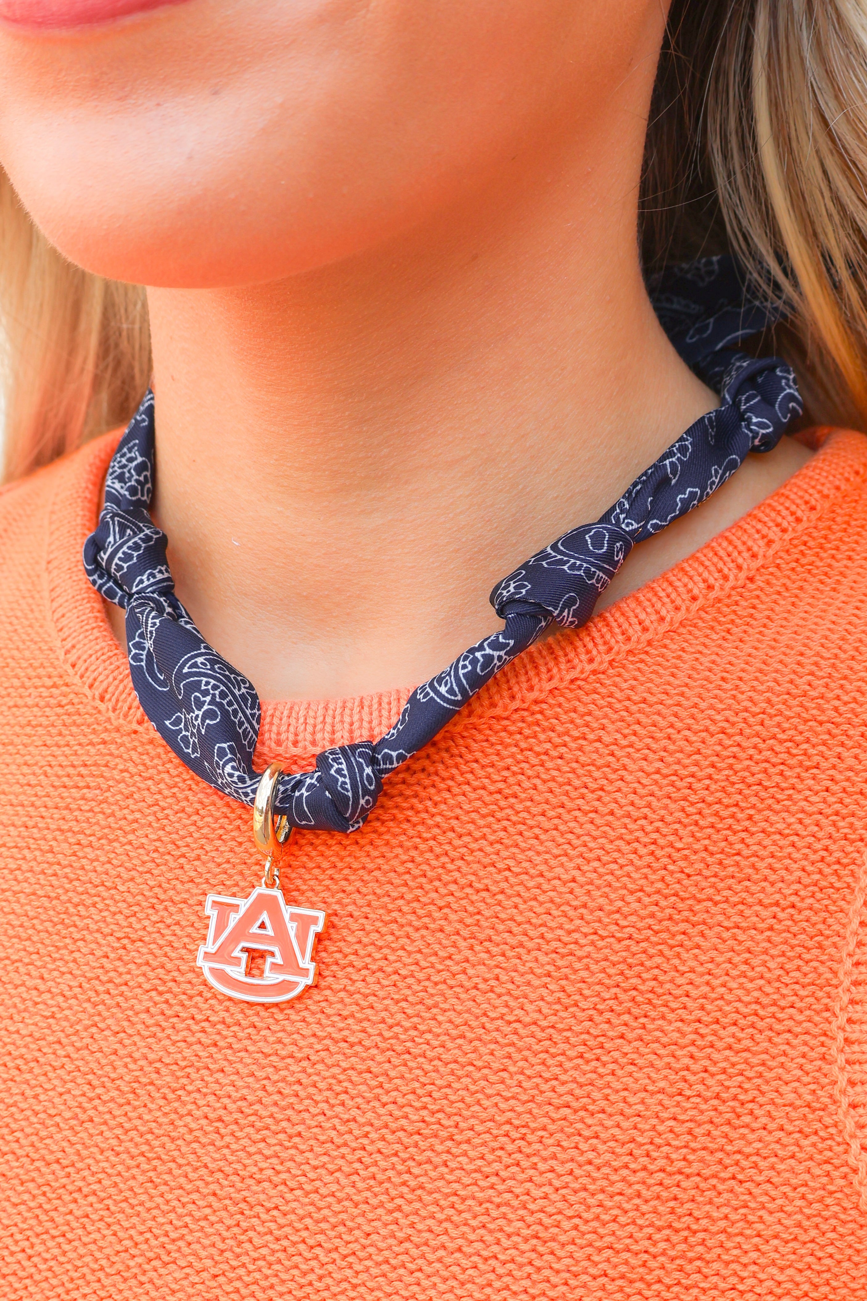 Wear our One For The Team Auburn Logo Scarf Necklace with a dress and boots for a gameday look. Or style with denim shorts and a tank for a more casual outfit! The adjustable scarf allows you to decide how long you would like this pendant necklace and also adds room in case you are wearing a high neck top. Buy this scarf necklace now! It goes with everything!