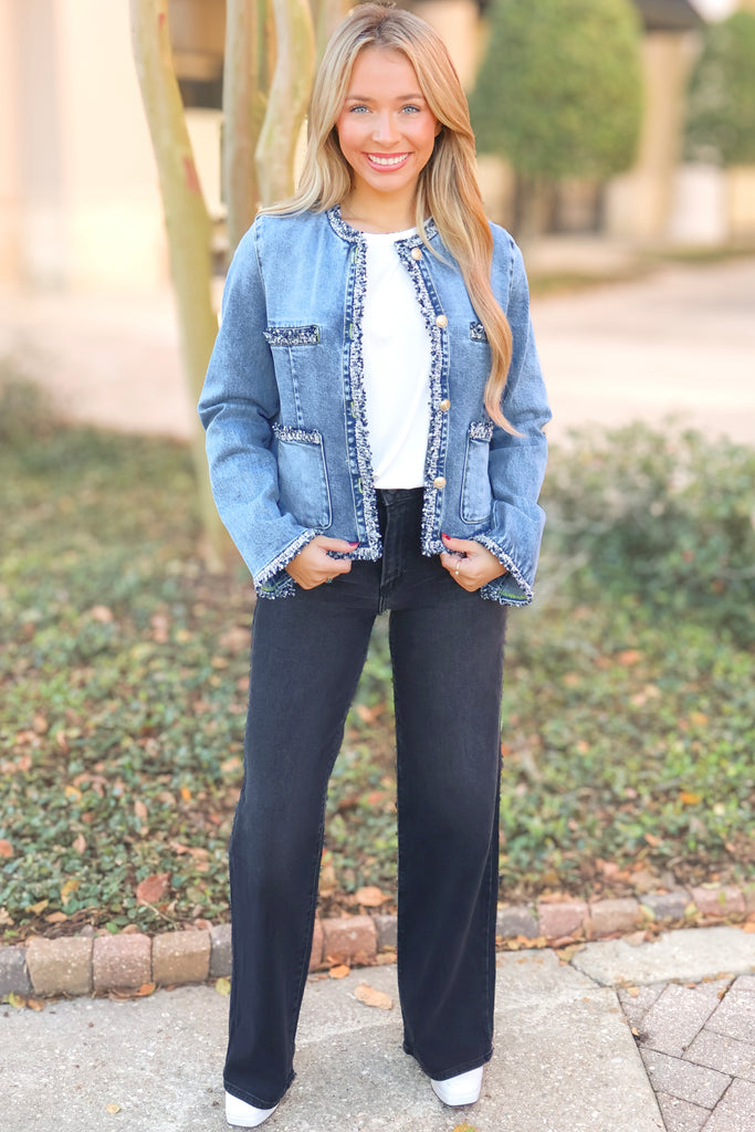 Our Out Downtown Tweed Trim Denim Jacket is the perfect new addition to your wardrobe! This fabulous denim jacket can be paired with practically any outfit or event! The tweed trim, button up design, and fun soft material add a flair to the simple jacket. Stay comfortable and warm during game days or shopping days thanks to the soft, sturdy material of this fabulous jacket.