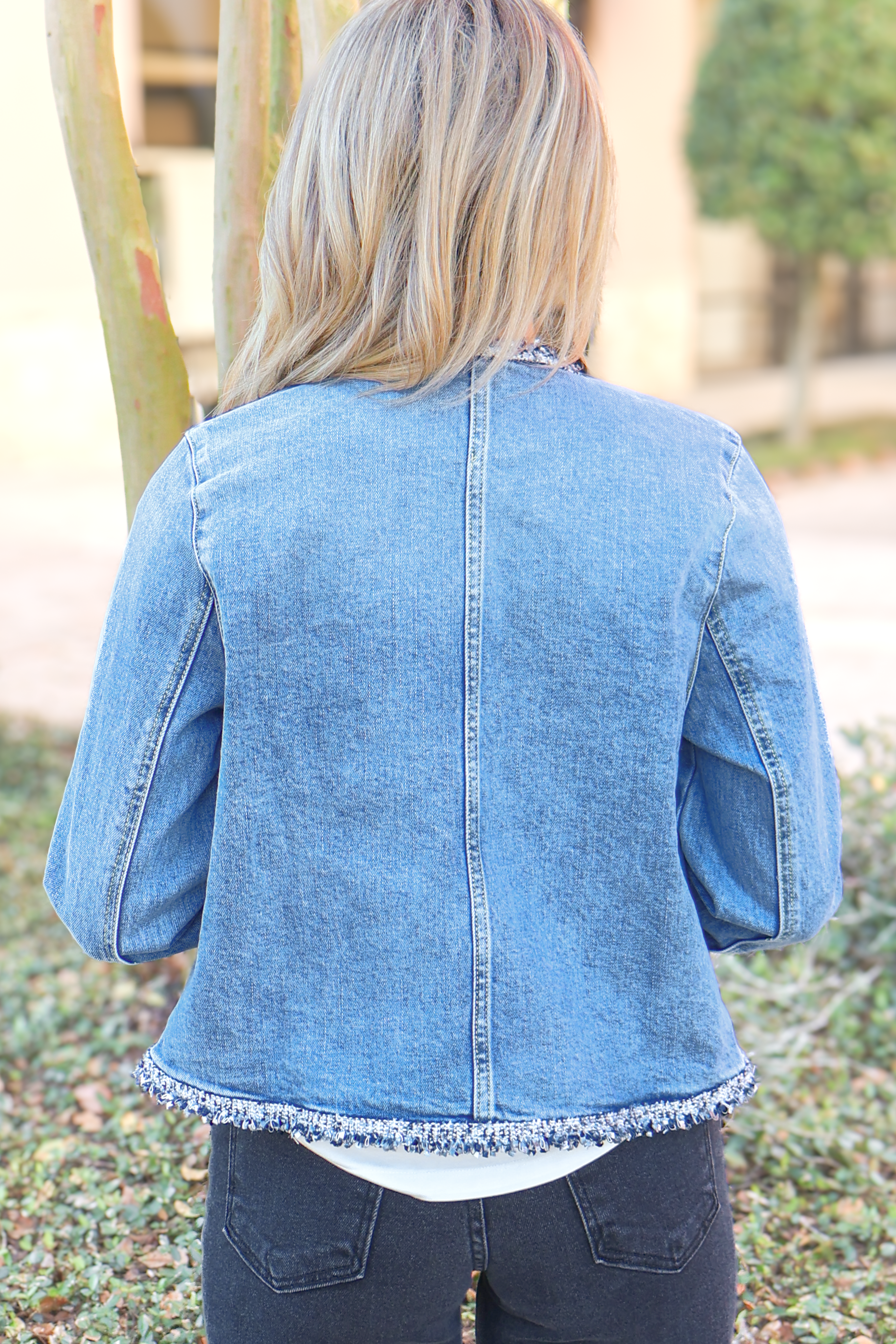Wear our Out Downtown Tweed Trim Denim Jacket with a sweater and leggings with booties for a cute fall look. Or style this denim jacket with one of our skorts and a fun sweater with knee boots for a stylish fall look! Elevate your fall wardrobe by adding this gorgeous tweed denim jacket to your closet now! Do not miss out on this tweed trim denim jacket!
