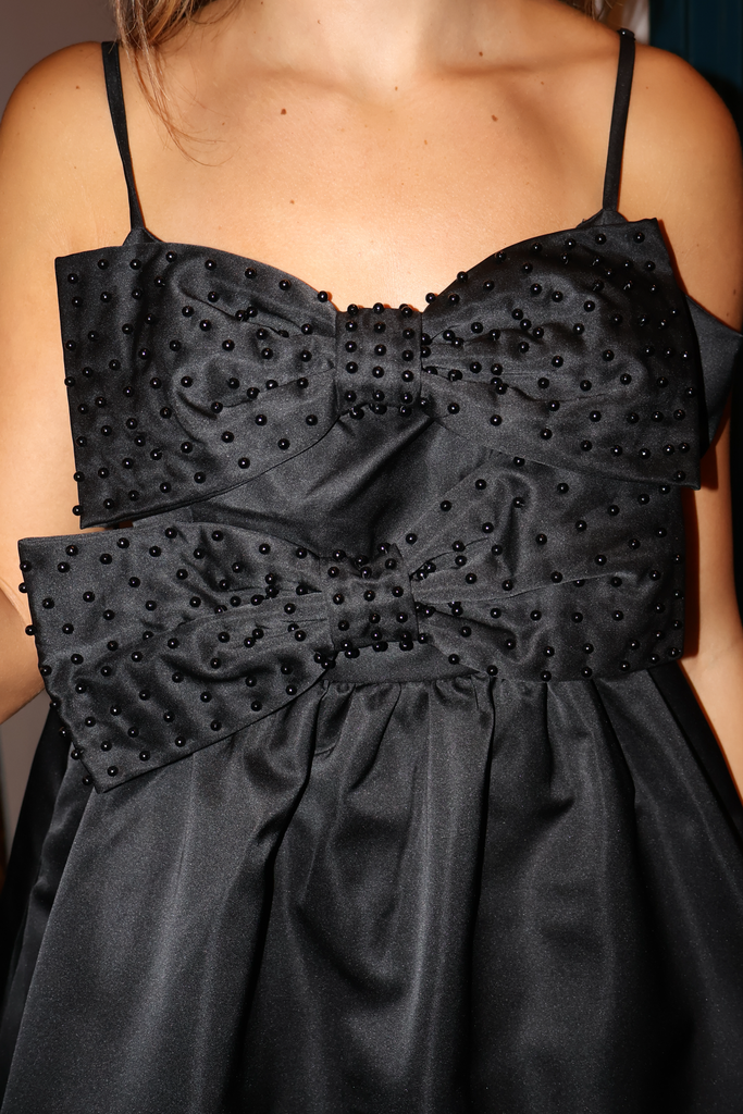 Our She's That Girl Double Studded Bow Detail Dress is the perfect new dress for the season! This flirty and fun piece will be the envy of everyone around! The structured and lightweight material as well as the mini length and sleeveless style make this dress a flattering choice for every body type. The studded double bow and the black satin material details add a flair to the piece. The black color and style of this dress are so classy and fun!