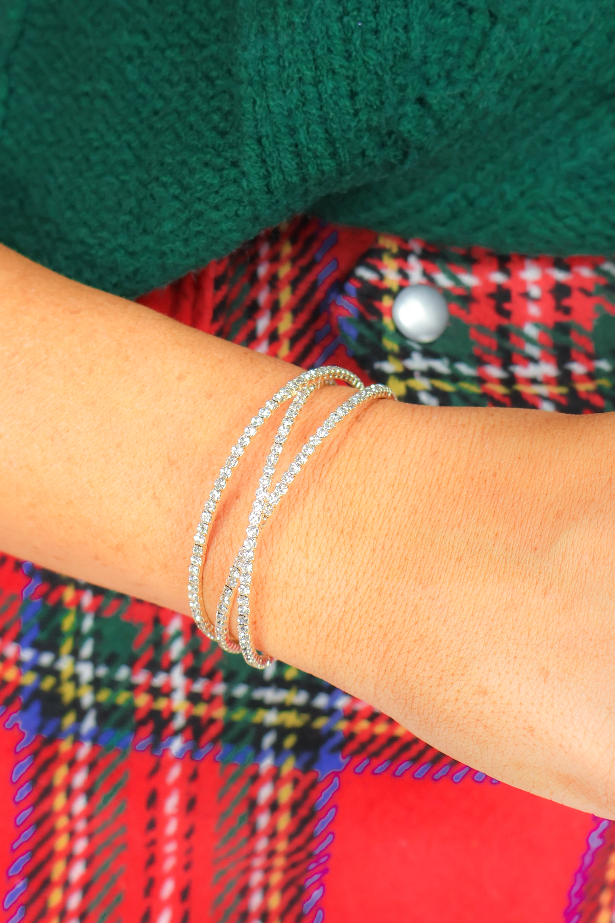 Pair our Worth the Wait Rhinestone Crossover Bangle with one of our our new christmas sweaters or style it with one of our evening looks for a night out! You need this adorable accessory! You do not want to miss out on this gorgeous rhinestone bangle! This crossover bangle bracelet will be your new go to accessory all season long!